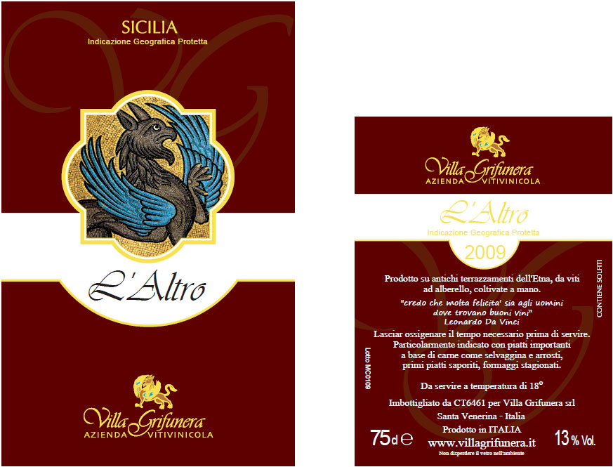 "L'ALTRO" Red Sicilian IGP, produced from grapes native of Etna, nerello mascalese, nerello cap or cloak, 13 ° degrees.